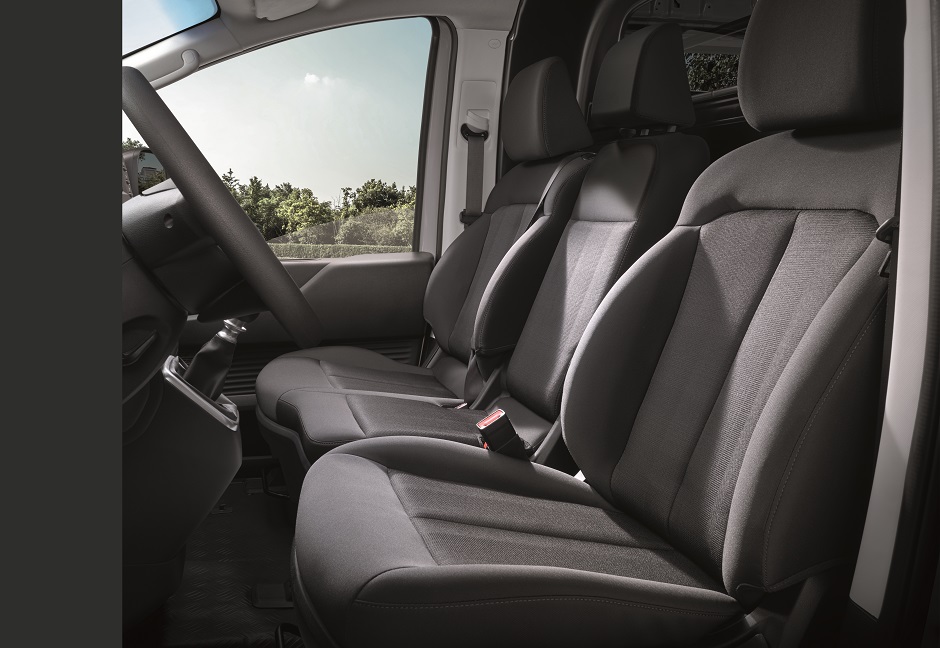 Su equipamiento incluye dos puertas laterales de corredera y doble puerta trasera; dos airbags, frenos ABS con EBD, control de estabilidad (ESC), asistente de arranque en pendiente (HAC), cinturones de seguridad para los tres pasajeros, volante regulable en altura y profundidad, sensor de estacionamiento trasero, alzavidrios eléctricos, cierre centralizado, aire acondicionado, apertura remota de estanque de combustible, asiento de conductor ajustable en altura, reclinable y deslizable, Bluetooth, control de audio al volante, computador de a bordo con pantalla TFT LCD de 4,2”, dirección asistida eléctricamente, espejos exteriores eléctricos y calefaccionados, llave plegable con cierre a distancia, luces de posicionamiento halógenas, radio con pantalla LCD de 3,8” con entrada USB, además de separación de compartimiento de carga, piso y techo de metal.