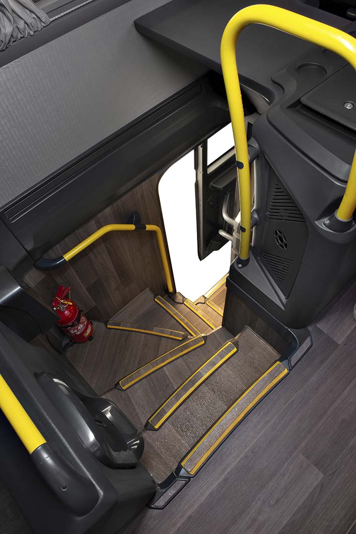 Manteniendo el énfasis de la marca por la seguridad, el Marcopolo G8 cuenta con una zona traslúcida en la parte inferior de la puerta derecha que ayuda a visualizar pequeños objetos y plataformas de embarque.