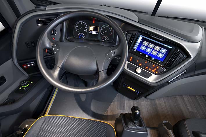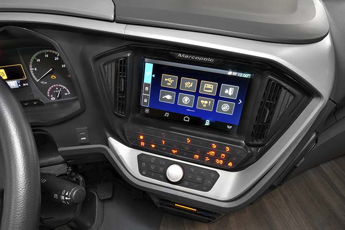 El tablero de instrumentos tiene pantallas de 5 ó 10 pulgadas con las que se accede a todas las funciones del bus y es 3,5 veces mejor que los que ya existen en el mercado. Su altura se reduce en 70 milímetros para aumentar la visibilidad al exterior.