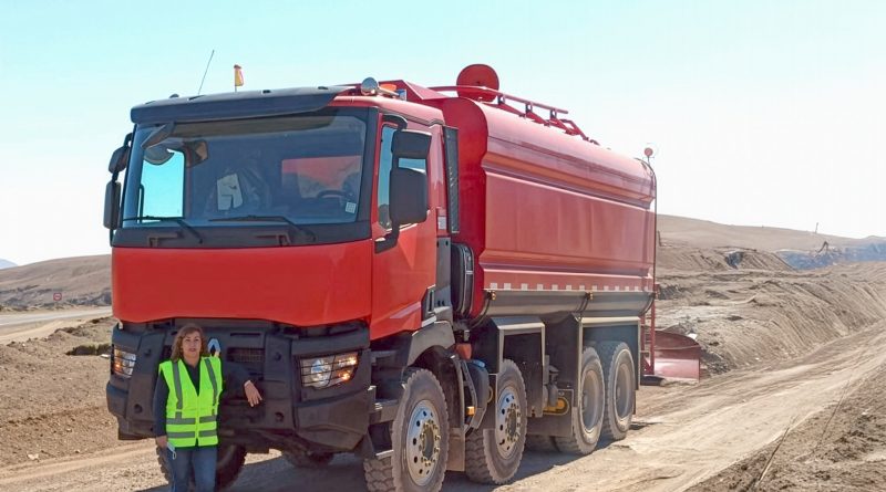 Campos, de 49 años, trabaja en Transportes Perucci y actualmente conduce un Renault K480 aljibe transportando agua para faenas mineras y proyectos energéticos en la zona norte. Con cuatro años de experiencia, es la única mujer entre cerca de 100 conductores de la empresa.