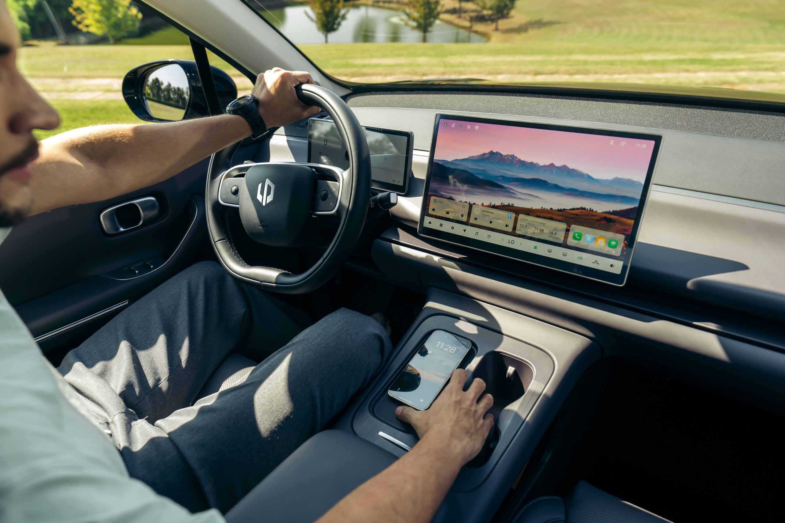 Detenerse unos minutos para recargar energías también es parte de darle un respiro a la mente. El C10 incorpora un modo de descanso que transforma el interior en un espacio pensado para hacer una pausa real: permite reclinar completamente los asientos delanteros hasta generar una superficie plana junto a los traseros, atenuar o apagar las pantallas del habitáculo y seleccionar ambientes sonoros relajantes. Además, es posible programar la duración de la pausa, creando un entorno más silencioso y con menos estímulos visuales antes de retomar la conducción.