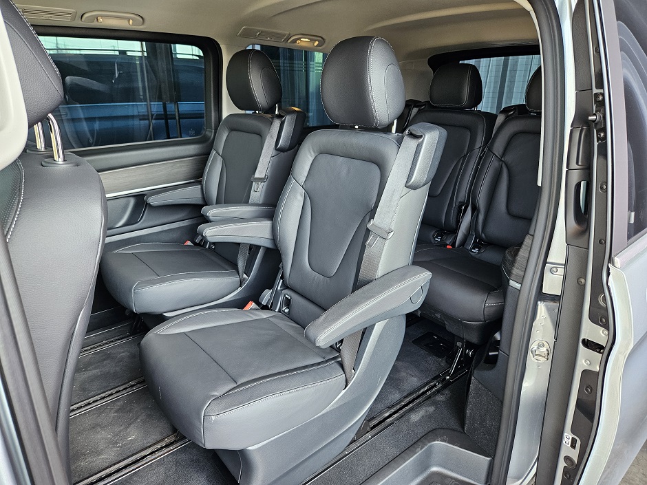 El interior de la V-Class 2024 sigue el estándar de lujo característico de Mercedes-Benz. Desde que abrimo la puerta, tenemos esa sensación de elegancia, el sonido de la manilla, es característico, suave y fuerte al mismo tiempo, certero en su abrir y dar la impresión exacta que el conductor busca o reconoce al subirse a esta VAN, la V-CLASS, se enorgullece de pertenecer al selecto grupo de vehículos de alta gama de Marcedes y siendo un vehículo para flotas o pasajeros, es en todo sentido un lujo. Este modelo, ha sido diseñado y desarrollado para acomodar hasta seis pasajeros en un entorno de máxima comodidad, con asientos de cuero y materiales de alta calidad, permiten que cada pasajero o acompañante del conductor, experimente una sensación individual y única. A la mano del conductor, tenemos en volanta multifunción, forrado por supuesto en cuero, todos los controles de la nueva tecnología que incorpora dos pantallas de 12,3 pulgadas que forman parte del sistema MBUX, ofreciendo una interfaz intuitiva y una experiencia de usuario altamente personalizada. El sistema “Hey Mercedes” permite una interacción por voz fluida, facilitando el control de diversas funciones del vehículo sin necesidad de apartar la vista de la carretera, así como pedirle que nos diga la hora, como está el tiempo en nuestra ciudad u otra distinta, subir o bajar el volumen de la música, reproducir música, así como también comando complejos como subir o bajar ventanas, entre otras cosas. Sin duda nuestra experiencia, fue muy confortable y placentera, no sólo por cada detalle bien cuidado dentro de la cabina de la V CLASS, sino que además por que todo ello, lleva un paquete de seguridad de primer nivel y con el que Mercedes Benz siempre ha entregado con antelación a sus vehículos y usuarios.